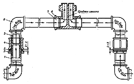 Схема подводки горячей и холодной воды к тройнику «Елочки»: 1 — подводящая трубка; 2 — контргайка; 3 — уплотнение; 4 — муфта; 5, 7 —