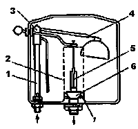 | Бачок с нижней подводкой воды: 1 — стойка; 2 — перелив; 3 — вертикальный поплавковый клапан; 4 — рычаг; 5 — тяга; 6 — груша; 7 — седло. |